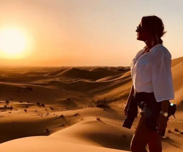 Leave the hustle of city life behind and witness the beauty of the desert at sunrise—a magical time when the sands shimmer and the landscape glows.
